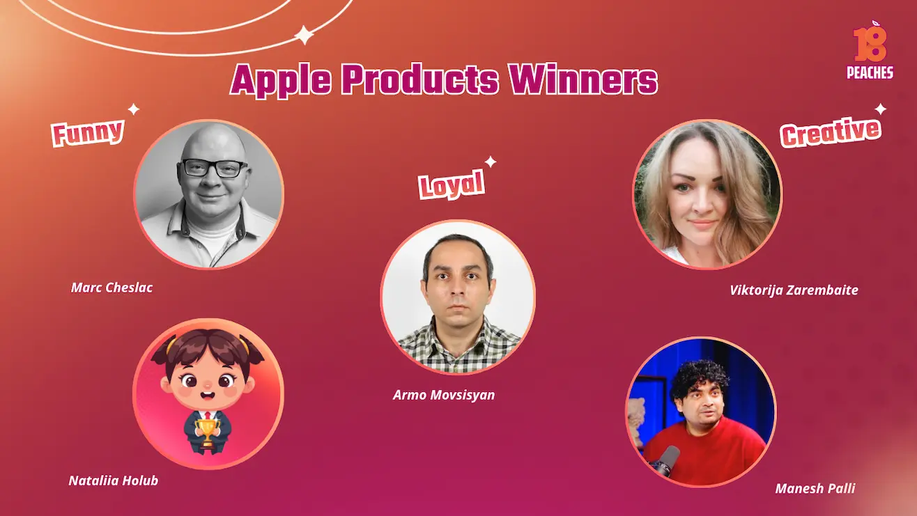 It was very difficult to choose since there were so many of you. For the Funny and Creative Categories, we have chosen two winners instead of one. The Apple products go to Viktorija Zarembaite and Manesh Palli in Creative, to Armo Movsisyan in Loyal, and to Marc Cheslak and Nataliia Holub in Funny. Winners can pick up prizes on Day 1 or confirm another way to receive them if they will not attend.
